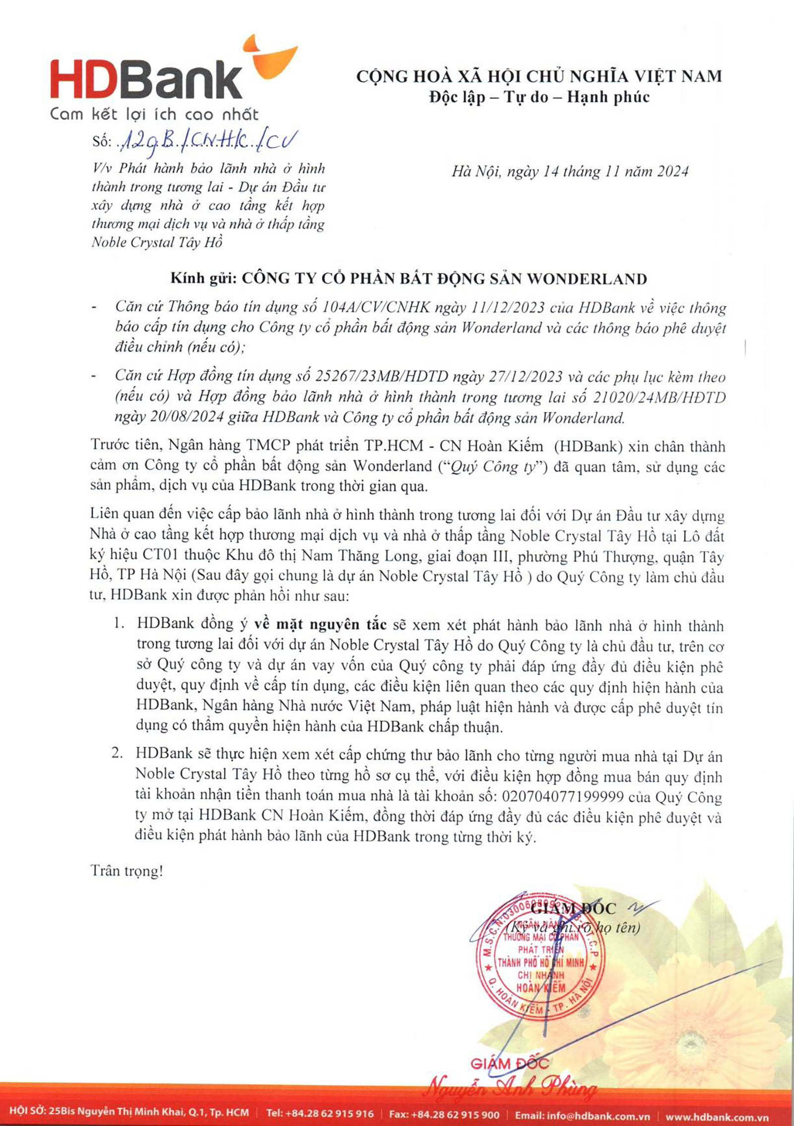 Ngân hàng HDBank đã chính thức phát hành thông báo bảo lãnh cho dự án Noble Crystal Tây Hồ, thể hiện sự đồng hành và hỗ trợ tài chính vững chắc cho dự án. Việc có bảo lãnh từ ngân hàng uy tín như HDBank giúp tăng cường niềm tin của khách hàng, giảm thiểu rủi ro pháp lý và tài chính trong quá trình giao dịch mua bán căn hộ.