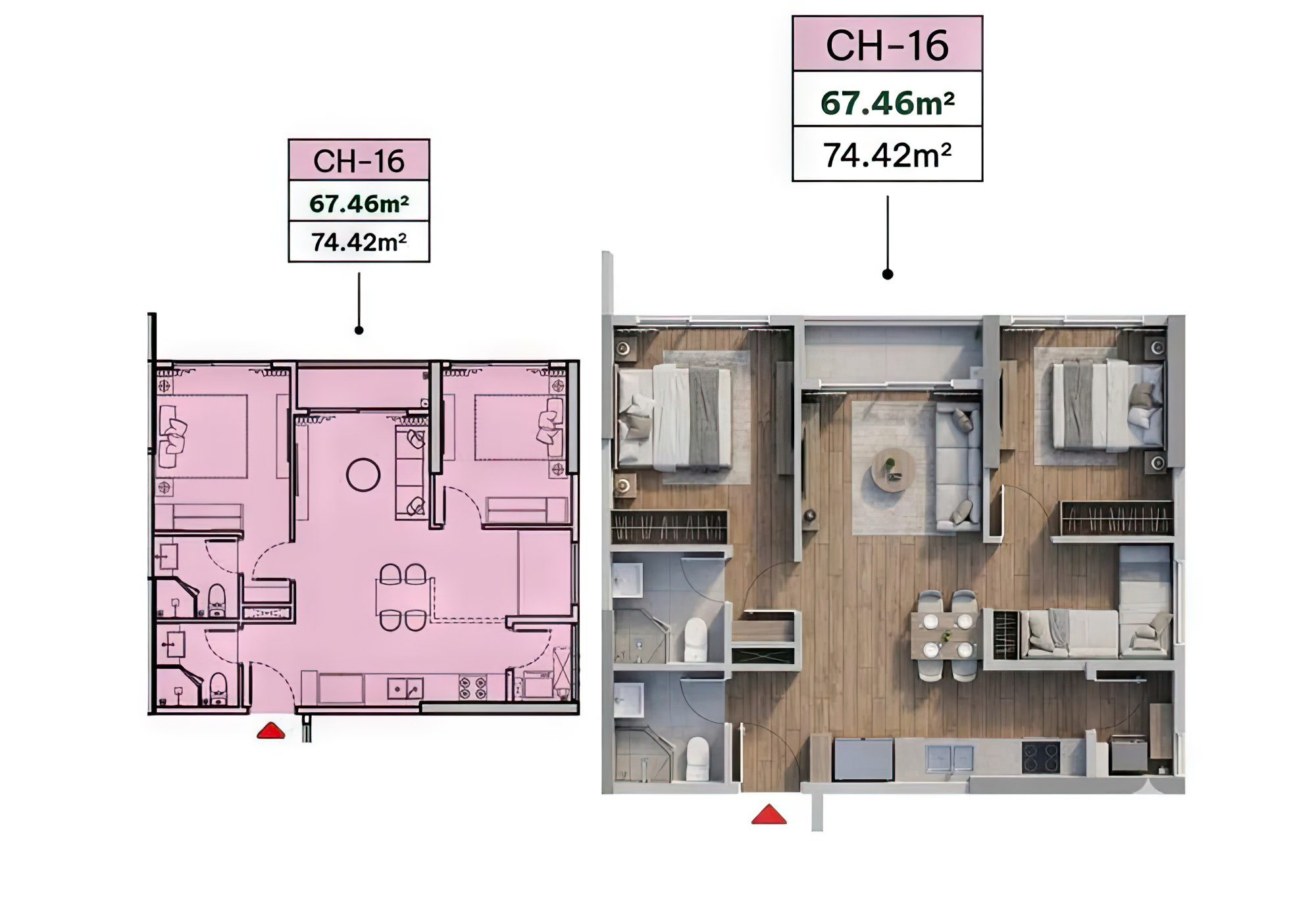 | Căn hộ 2PN+ | 66 - 68m² |
